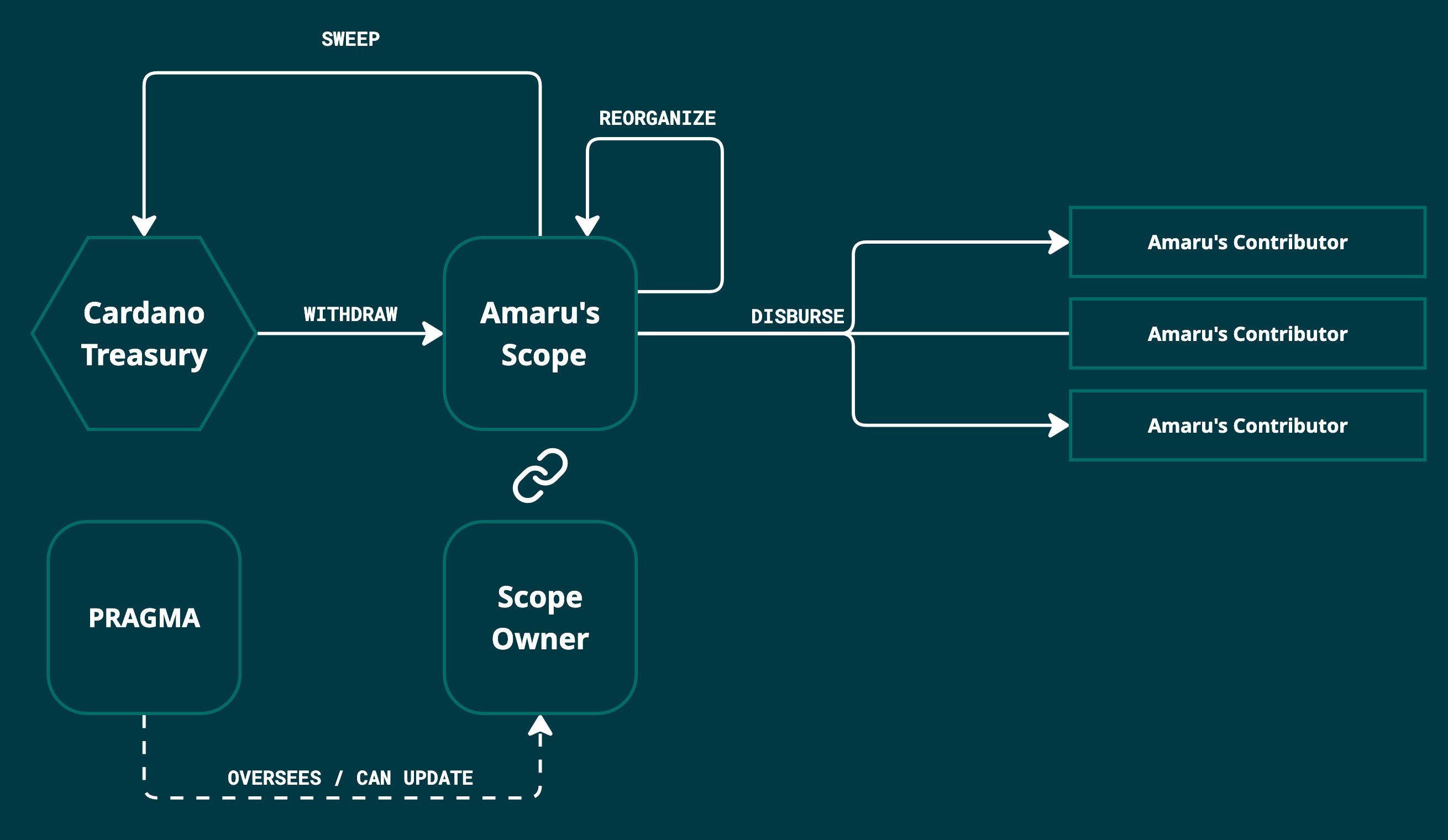 The Amaru maintainer committee ensures direct administration of its budget, assisted by an on-chain smart contract. Off-chain, the fund management, responsibilities and remuneration of contributors follow PRAGMA's Maintainer Committee Framework. Additionally, the smart contract's role is to ensure that funds are expended under the scope of work defined in this budget and authorized by the relevant scope owners.